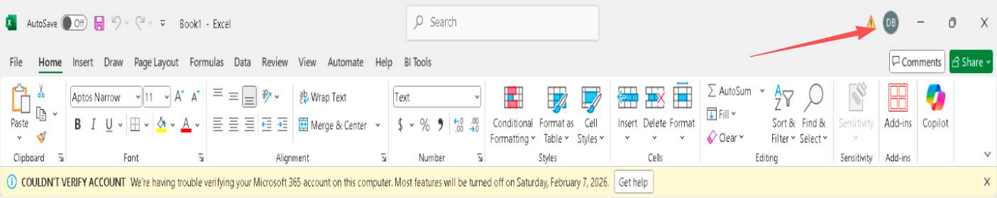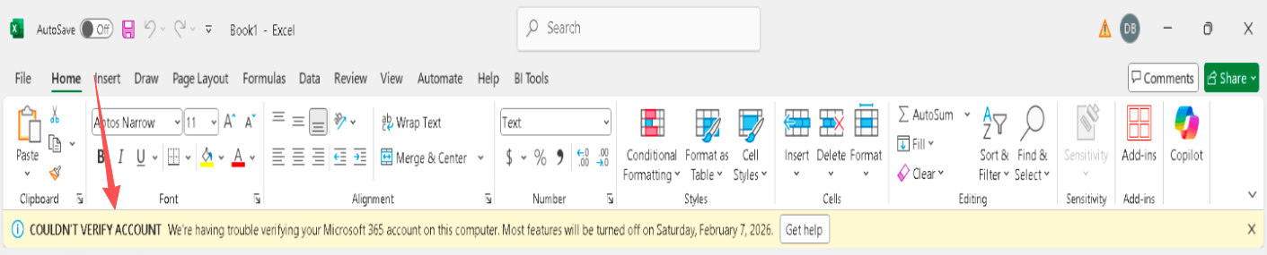 You receive a message on your Excel stating that you couldn't verify your account