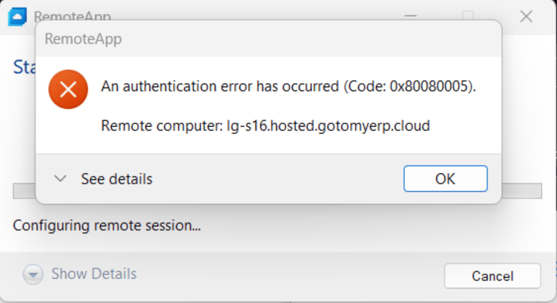 "An authentication error has occurred (Code: 0x80080005)