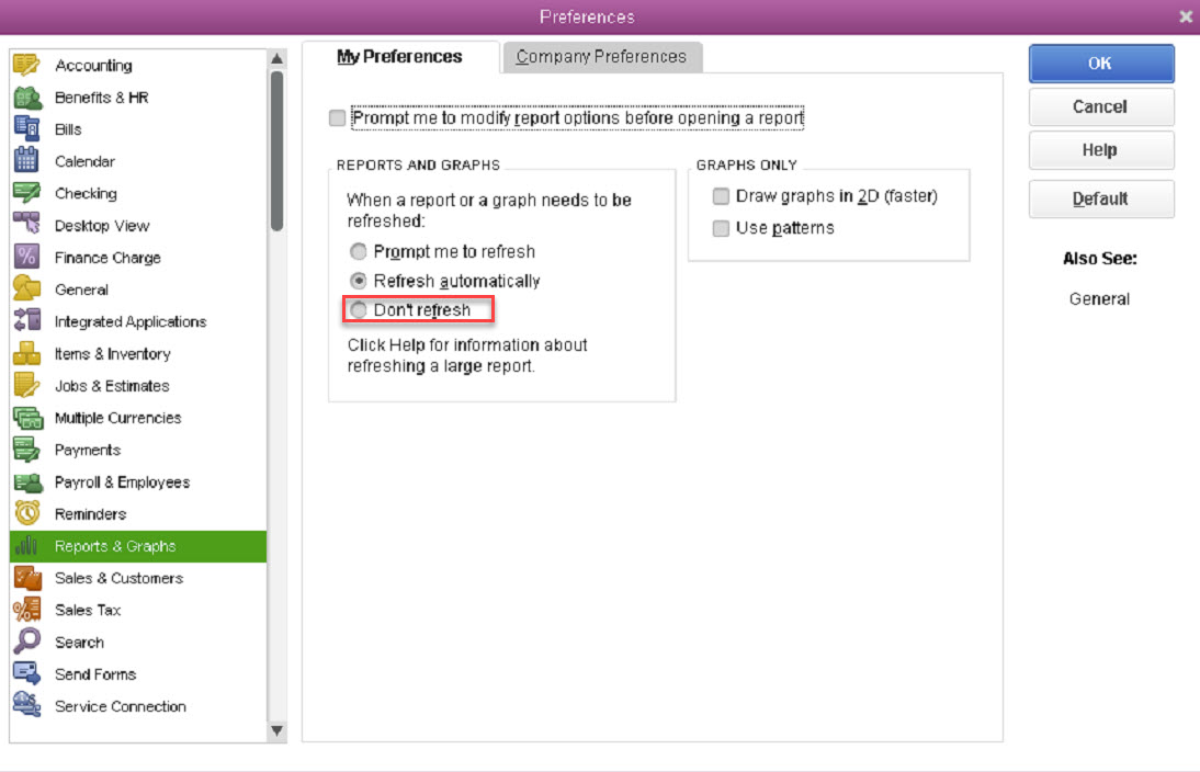 - Changing "When a report or graphs needs to be refreshed" to "Don't refresh" (Edit --> Preferences --> Reports & Graphs)