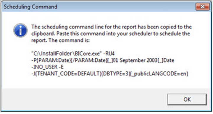 After confirmation, a message box appears containing the full command syntax. This command is also copied